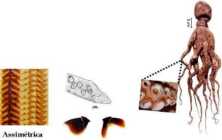 Octopus cf vulgaris – Animal grande, podendo atingir até 1,5 metros. Braços médio a longos em relação ao manto. Membrana mediana. Habitat: Rochas, recifes de coral, lama